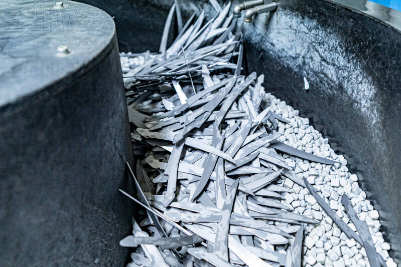Im Anschluss werden die Klingen präzise auf modernen CNC-Maschinen geschliffen und poliert, um höchste Maßhaltigkeit, perfekte Oberflächenqualität und optimale Hygiene sicherzustellen.